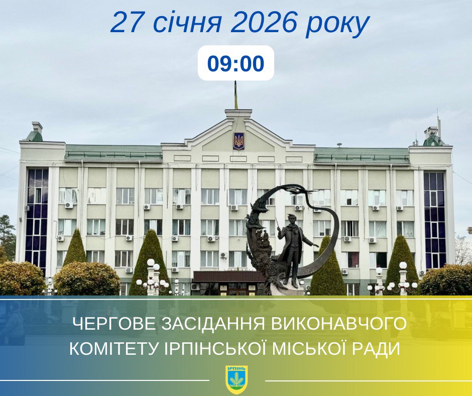 27 січня 2026 року о 09:00 в залі засідань міської ради відбудеться чергове засідання виконавчого комітету Ірпінської міської ради