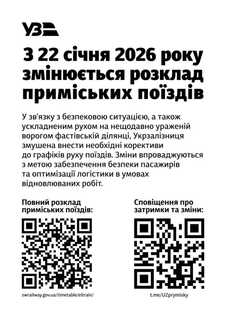 У звʼязку з безпековою ситуацією, а також ускладненим рухом на нещодавно ураженій ворогом фастівській ділянці, Укрзалізниця змушена внести необхідні корективи до графіків руху поїздів.