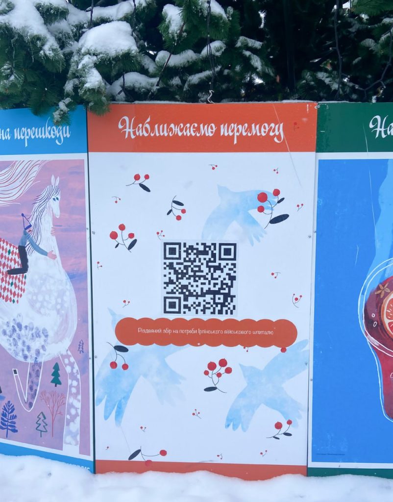 На центральній ялинці, а саме біля її підніжжя, встановлені художні опори, на яких, окрім новорічних малюнків, є QR-коди. Це посилання на збір, який за підтримки нашого відділу культури, національностей та релігій відкрила волонтерська організація Ганусині котики.
