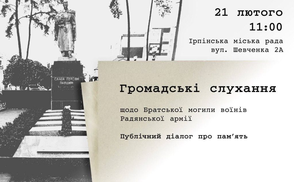 Головною темою громадських слухань щодо об’єкта культурної спадщини є “Братська могила воїнів Радянської армії, які загинули за визволення Ірпеня від німецько-фашистських загарбників у 1943 році”, що розташована по вул. Центральній, навпроти залізничного вокзалу.
