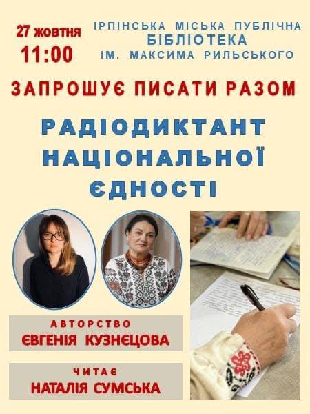27 жовтня об 11:00, у День української писемності та мови, Ірпінська міська публічна бібліотека імені Максима Рильського запрошує жителів громади приєднатися до традиційної щорічної акції з написання Всеукраїнського диктанту національної єдності.