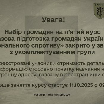 Добровольче формування Ірпінської міської територіальної громади №1 та Муніципальна варта ІМР проводять навчальний курс підготовки до Національного спротиву для мешканців громади. Під час курсу курсанти освоюють навички поводження зі зброєю, техніку безпеки при її застосуванні, вогневу підготовку, тактичну медицину, військовий зв’язок, військову топографію та ін.