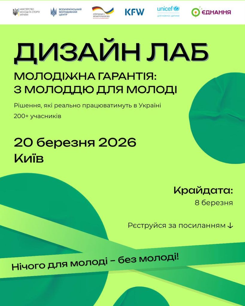 Дизайн-лаб “Молодіжна гарантія: з молоддю для молоді” – це простір, де молоді люди разом із представниками держави та експертами створюють рішення для працевлаштування, освіти та професійного розвитку молоді. Зустріч є частиною комплексу заходів, спрямованих на формування ефективної реалізації ініціативи Європейського Союзу “Молодіжна гарантія” в Україні. “Молодіжна гарантія” покликана забезпечити, щоб усі молоді люди отримували якісну пропозицію працевлаштування, продовження освіти, професійного навчання або стажування протягом чотирьох місяців після того, як вони стали безробітними або завершили формальну освіту.