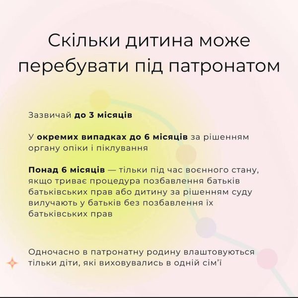 Навіть у випадках, коли дитина більше не може проживати з біологічними батьками, наприклад через позбавлення батьківських прав або на жаль, загибель батьків – вона перебуває в патронатній родині, поки вирішується питання з пошуку опікунів, прийомних батьків чи підбирається інша форма сімейного влаштування.