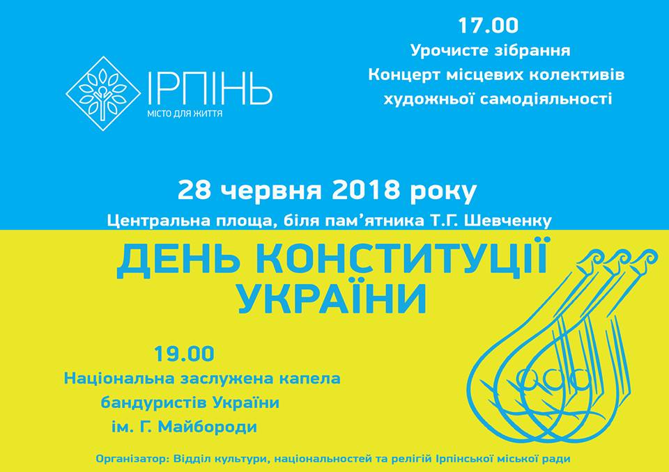 28 червня 2018 року в Ірпені на центральній площі, біля пам’ятника Т.Г. Шевченку відбудуться урочистості з нагоди святкування Дня Конституції України.
