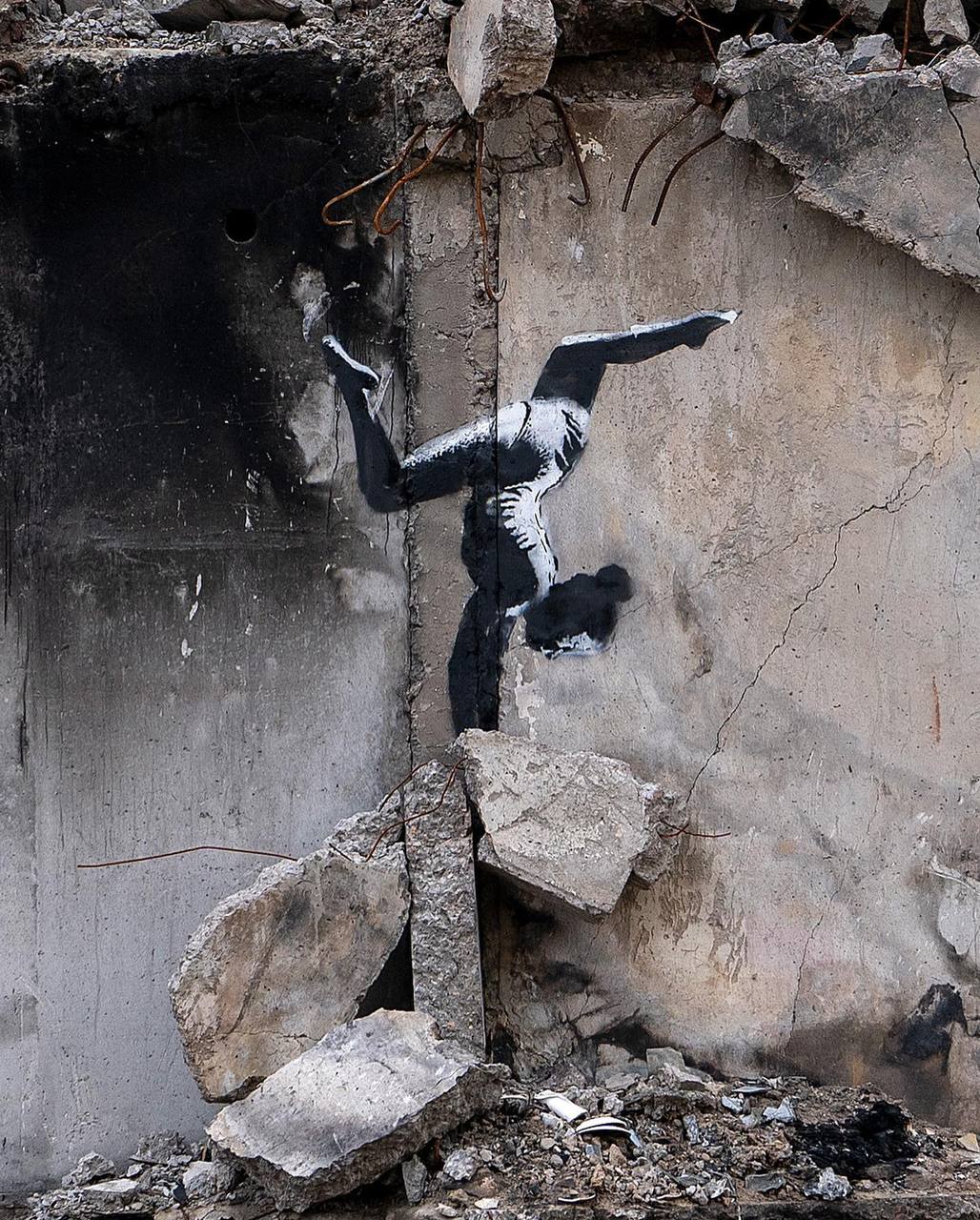 «На стіні зруйнованої будівлі в Ірпені на Київщині видно графіті жінки у трико та шиї, яка розмахує стрічкою. У Бородянці, далі від столиці України, на стіні зруйнованої будівлі намальовано графіті жінки в трико, яка робить стійку на руках»,-зазначив фотожурналіст Ед Рам.