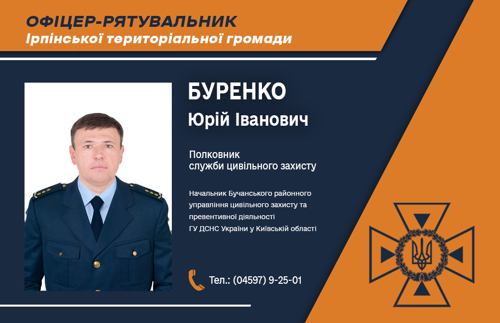 начальника Бучанського районного управління цивільного захисту та превентивної діяльності ГУ ДСНС України у Київській області полковника служби цивільного захисту Юрія Івановича Буренка.